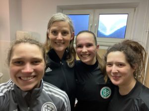 Frohgelaunt aus der Kabine in Flensburg grüßte das Unparteiischenteam (v. l. n. r.): Levke Scholz (Lübeck – 4. Offizielle), Sylvia Peters (Lübeck – SRA1), Celina Böhm (SR) und Melina Willig (Benefeld – SRA2).